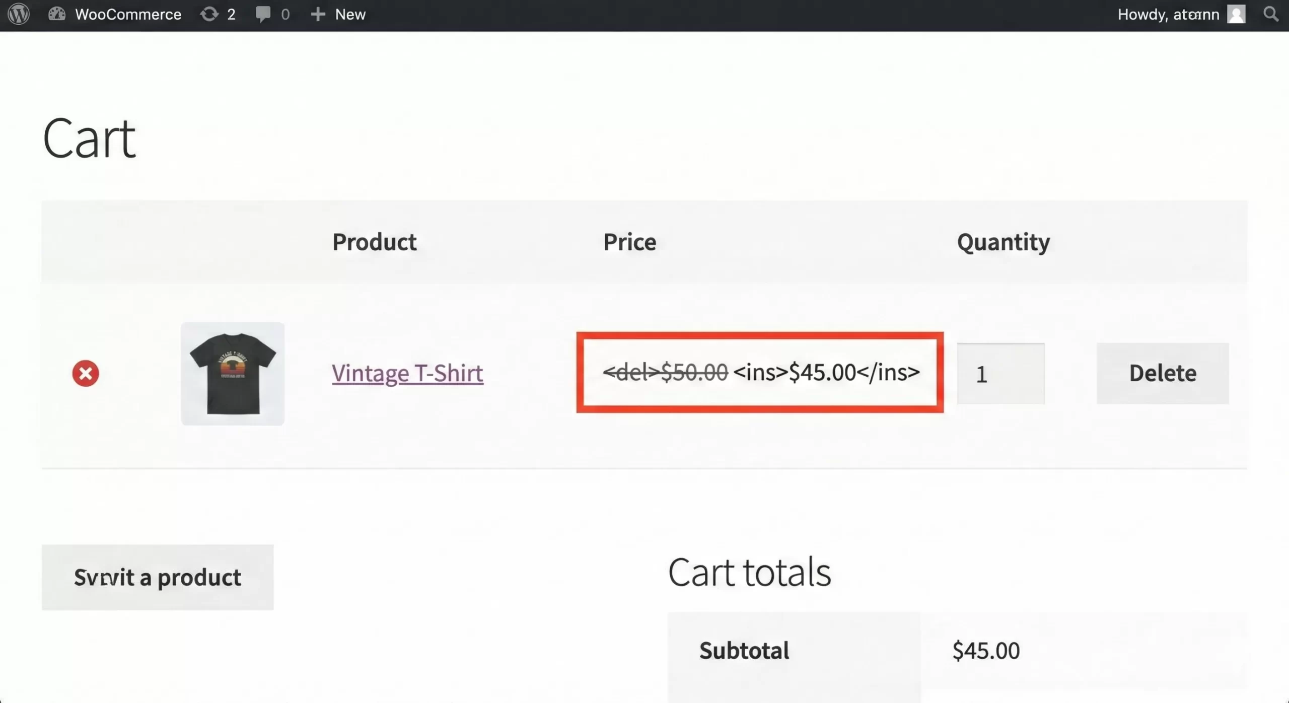 Ideally, when a discount is applied, the user should know about it. Silently changing the price can confuse customers (“Why is the price different than what I saw on the shop page?”). We need to add visual feedback to the cart page indicating that our WooCommerce dynamic pricing code has successfully applied a discount.