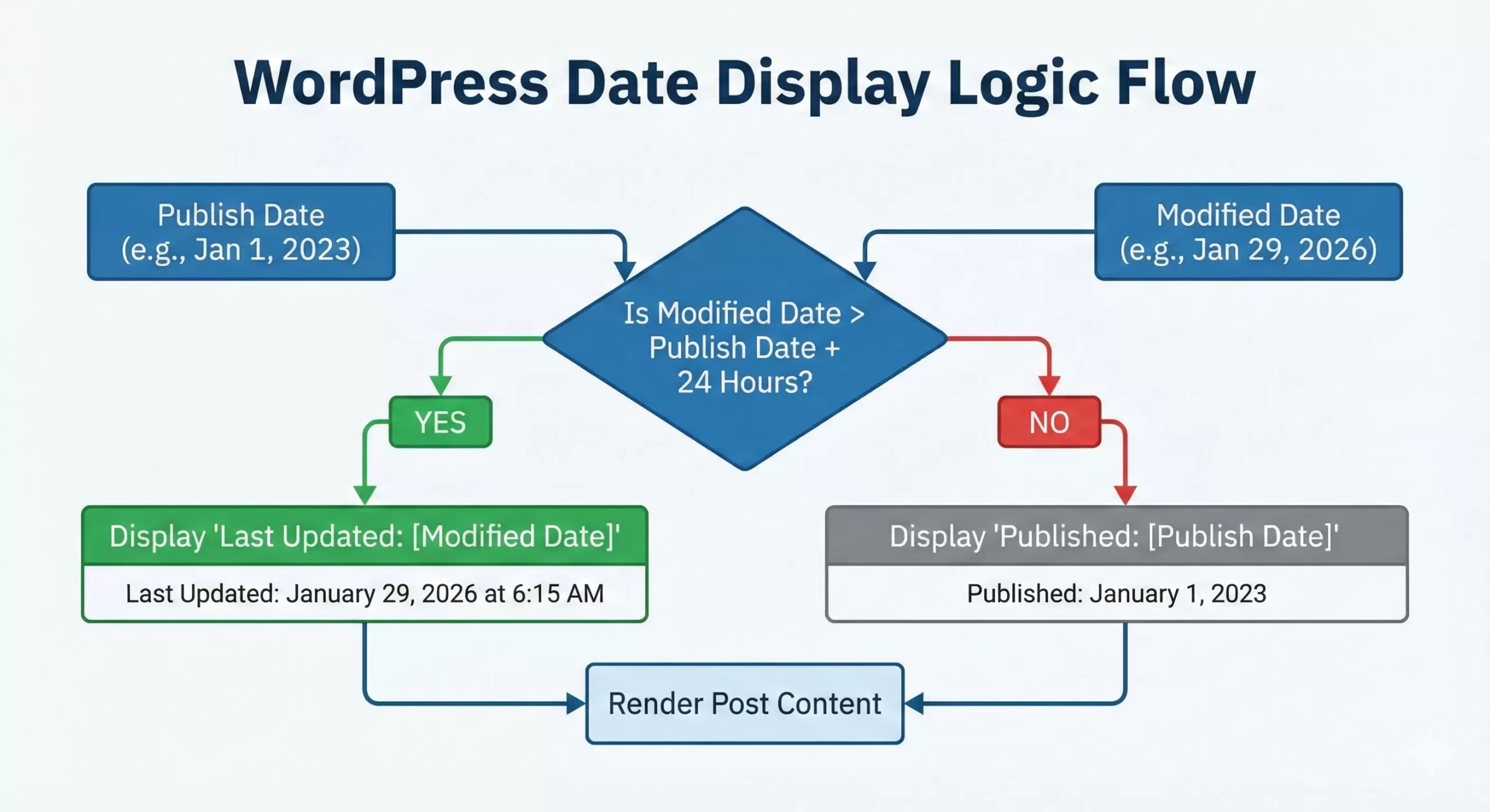The core logic we need to implement is a simple conditional comparison. We cannot simply output the modified date on every post; if a post has never been updated, the modified date is identical to the published date. Displaying “Last Updated: [Date]” on a post that hasn’t actually been changed looks redundant.